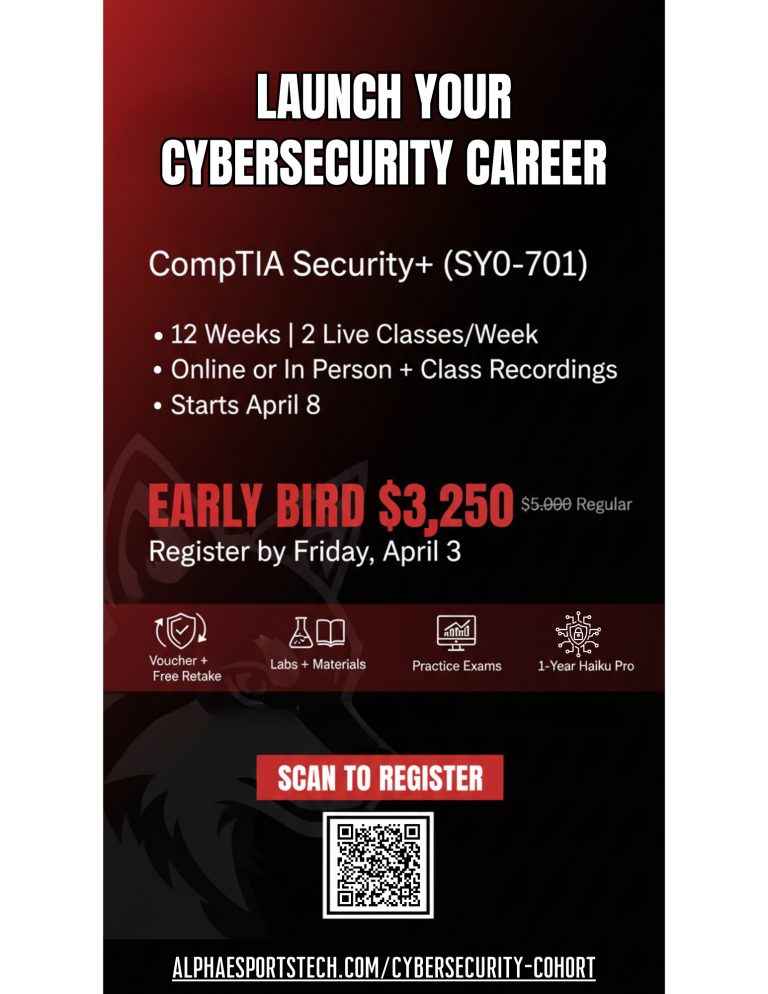 Cybersecurity continues to be one of the fastest-growing career fields, and strong foundational training matters more than ever. At Alpha Esports & Technology, we are excited to offer our Introduction to Cybersecurity 12-week cohort designed to help learners build practical skills, prepare for certification, and take the next step toward entry-level security roles.